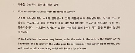 To avoid frozen water pipes this winter · Fill the water meter case with insulating material (old clothing etc.). · During the severe midwinter seasons the water meter still may freeze even with the above procedure. Therefore when you leave your place and even when there is no need to use water, turn on the faucet to let the water to drip continuously to a tub below. If the water meter gets frozen call 120 (DASAN CALL CENTER) or the Water company.