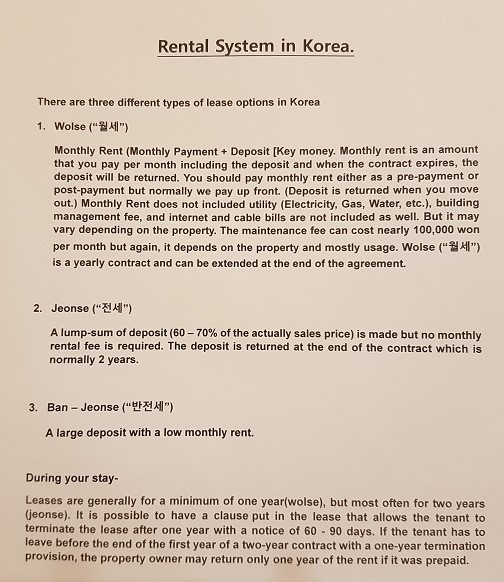 Monthly Rent (Monthly Payment + Deposit [Key money. Monthly rent is an amount that you pay per month including the deposit and when the contract expires, the deposit will be returned. You should pay monthly rent either as a pre-payment or post-payment but normally we pay up front. (Deposit is returned when you move out.) Monthly Rent does not included utility (Electricity, Gas, Water, etc.), building management fee, and internet and cable bills are not included as well. But it may vary depending on the property. The maintenance fee can cost nearly 100,000 won per month but again, it depends on the property and mostly usage. Wolse (“월세”) is a yearly contract and can be extended at the end of the agreement.