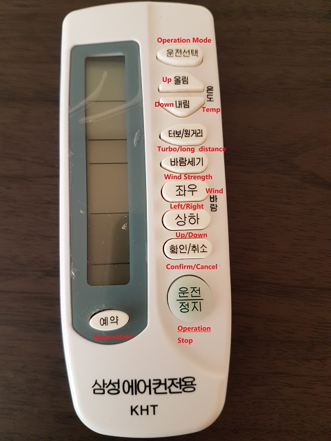 - “냉방” (naengbang) means A.C. You can change the temperature by pushing the pointing up means higher temperature and pointing down meaning lower temperature.